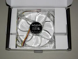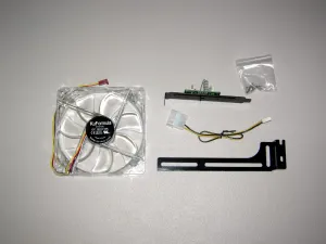 The Sytrin KuFormula SFFD120 arrived in a compact cardboard packaging with various graphics and information displayed on the exterior. Inside the components consisted of a 120mm fan, expansion slot bracket, power adapter, mounting scews, and expansion slot fan controller.
