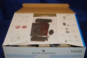 The box containing the Altec Lansing VS2421 speaker system was quite small and about half the size (or smaller) than the higher-end 2.1 Altec Lansing MX5021 speaker system we had looked at a number of years ago. The left and right speakers have only 2.5" drivers, the subwoofer is just 5.25” in size, and its box is rather slim. This speaker system is also rather on the light side. The Altec Lansing subwoofer was wrapped in a lightweight foam bag and the two speakers along with the control unit were wrapped in plastic. Two cardboard molds ensured that nothing moved around while in transit. Beyond the subwoofer and left and right speakers there was the VS2421 user's guide, two speaker stands, and the control unit. All of the cables for this 2.1 speaker system came pre-attached.