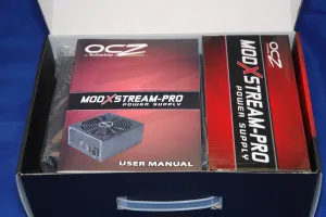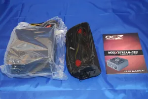 The ModXStream Pro packaging is faintly similar to that of other OCZ power supply packages we have looked at in the past. The red and black ModXStream Pro container highlights various features of this power supply such as its SLI readiness, 3-year warranty, and EZMod cable management. The box comes complete with a plastic handle to make it easy for transport. Inside there was the ModXStream Pro user manual, US AC power cable, the power supply itself (wrapped in plastic), and a bag that contained all of the modular cables for the power supply unit.