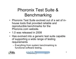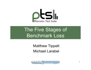 This weekend at the Southern California Linux Expo in Los Angeles, Matthew Tippett and I presented a talk entitled Five Stages of Benchmark Loss: PTS and You. In this hour-long talk, we covered Linux benchmarking, what has been learned over the years of benchmarking at Phoronix, the Phoronix Test Suite, and the five stages that users and developers generally go through when they lose out on benchmarking results. For those that were unable to attend this event, here are the slides and recordings.