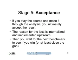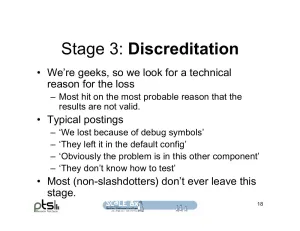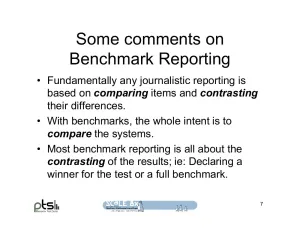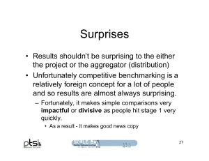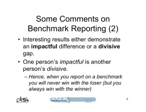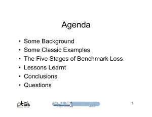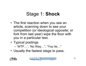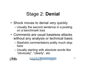 Below are the slides that were presented to cover the five stages of benchmark loss. For those that prefer viewing them as an Adobe PDF file, the slides can also be found here. The Five Stages of Benchmark Loss developed by Matthew and modeled after the Kübler-Ross model of Five Stages of Grief include shock, denial, discreditation, analysis, and acceptance.