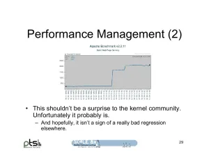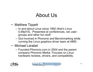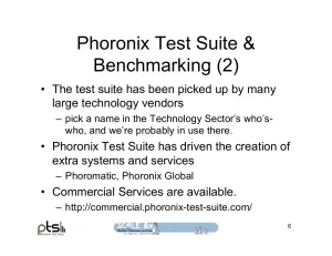 We recorded a 720p HD video of the talk, but alas, due to the large file-size it is not yet available. The extracted audio of the talk can be found in MP3 and Ogg formats. This audio goes along with the slides. A few small details concerning features in future versions of the Phoronix Test Suite were also touched on during the talk as well as Phoromatic.