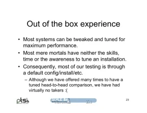 If anyone has any questions about this talk or would like more information, please let us know. On Saturday we also opened up commercial.phoronix-test-suite.com for the emerging PTS Commercial support offerings. We also had several interesting discussions with others at this Linux conference and we hope to have some very interesting announcements to make in the near future concerning the Phoronix Test Suite family of products.