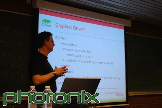 John Bridgman's talk at FOSDEM, Egbert Eich, who is one of the Novell developers working on the RadeonHD driver, had talked about the status of the RadeonHD driver. This talk went over a number of topics from the ATI GPU block design to the software abstractions with the AtomBIOS layer. No major breaking news came out of this talk, but just iterating information about xf86-video-radeonhd such as MMIO-base XAA/EXA R500 acceleration, full mode-setting for the R500/600 series, AtomBIOS disadvantages, and full RandR 1.2 support. Egbert had shared though that TV-Out support should be possible soon and it just needs TV encoding support. Digital output support for the RV620/635 chipsets should come next week. AtomBIOS support will provide scaler support, the second digital output block on the RS690, and support for unknown connectors. The bigger issues to tackle coming forward are DRM setup and R600 2D support. More information can be gathered from doing a